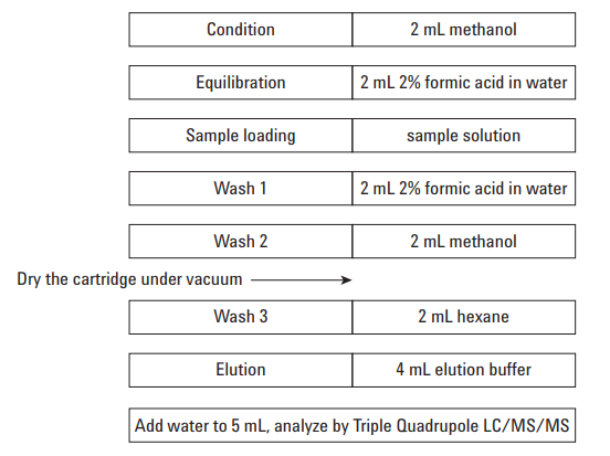 - Hoạt hóa cột Bond Elut Plexa PCX bằng 2 mL methanol và sau đó cân bằng với 2 mL acid formic (FA) 2% trong nước