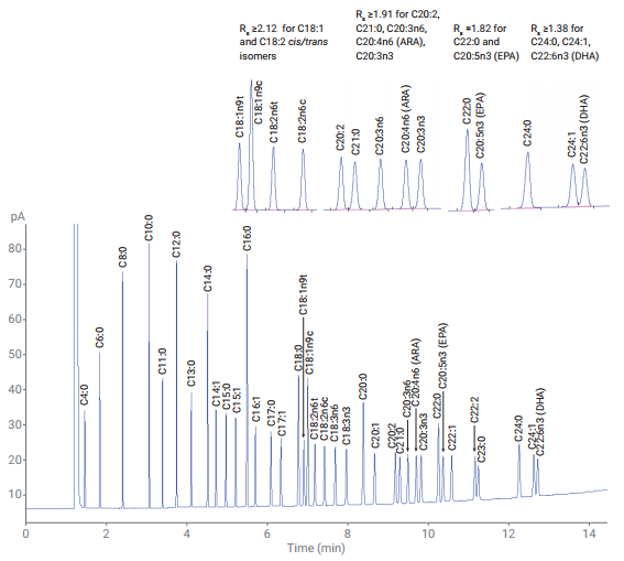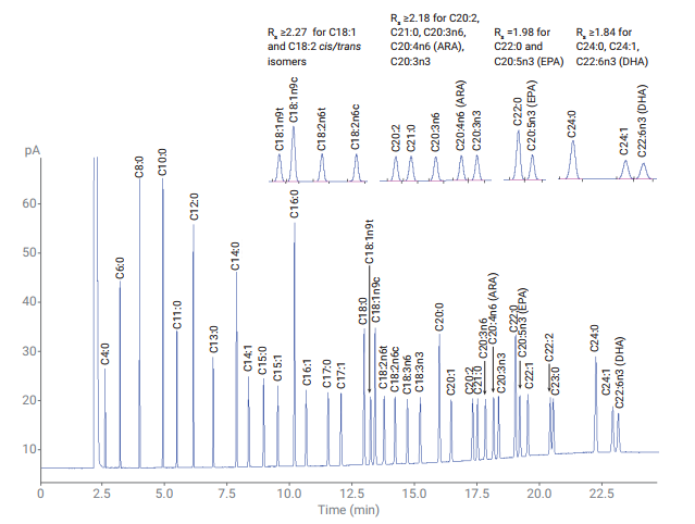 Thách thức của phương pháp phân tích acid béo là có một số cặp chất khó phân tách như cis-trans C18:1‚ cis-trans C18:2‚ C22:0-C20:3‚ C22:6-C24:1. Với cột DB-FastFAME‚ tất cả 37 hợp chất đều được phân tách tốt‚ peak đối xứng và thời gian dưới 25 phút. Với những ưu điểm trên‚ phương pháp này thích hợp dùng để định lượng acid béo trong các nền mẫu phức tạp‚ đặc biệt là phân tích EPA và DHA trong dầu cá.