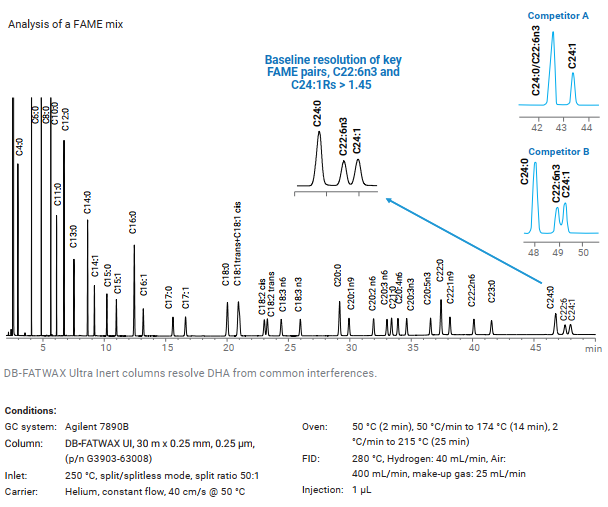 Hiện nay‚ hầu hết các quy định về thực phẩm trên khắp thế giới đều yêu cầu phân tích thành phần của nhóm Acid béo. Do đó‚ việc phát triển các phương pháp nhanh và đáng tin cậy để phân tích hàm lượng Acid béo là rất quan trọng. Agilent đã phát triển thành công một loạt các ứng dụng và các dòng cột có khả năng phân tích nhanh và hiệu quả FAMEs (Fatty Acid Methyl Esters) với độ phân giải vượt trội‚ ngay cả đối với các đồng phân cis-trans.